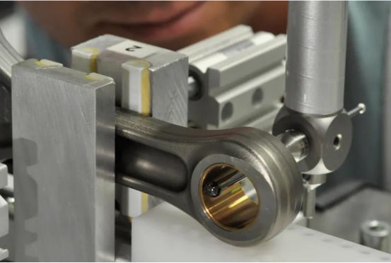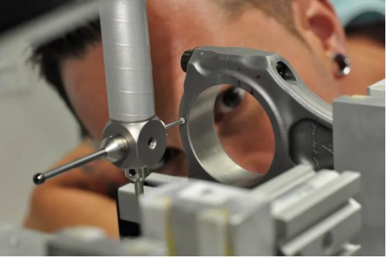 在Pankl技术质量保证部门工作的René Hautz对赛车发动机的连杆进行最终检查。使用蔡司钻石测针对曲轴上的轴承进行测量。